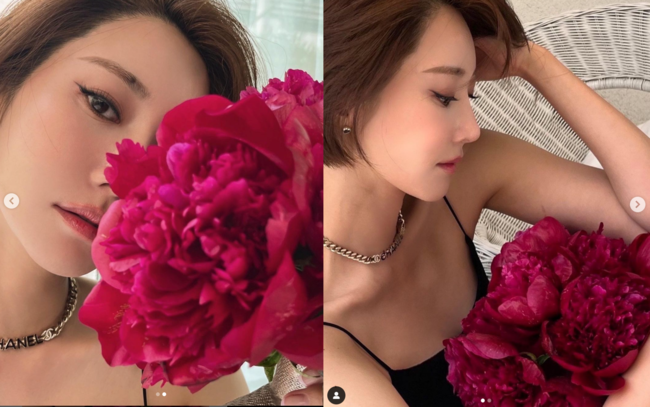 공개된 사진 속 그는 붉은 꽃다발을 바라보며 특유의 미모를 뽐내는 모습.