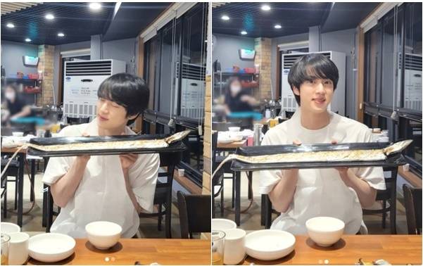 공개된 사진 속 진은 커다란 갈치구이가 담긴 접시를 들고 카메라를 응시하고 있다. 진은 반팔 티셔츠를 입고 편안한 매력을 드러냈다.