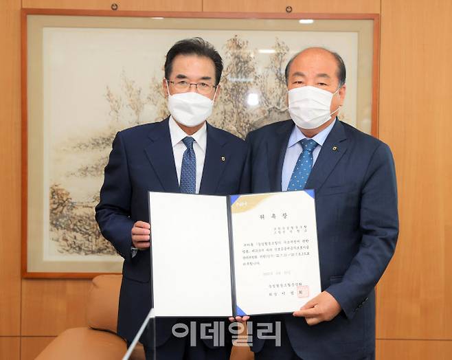 [이데일리 김태형 기자] 이성희(왼쪽) 농협중앙회장이 27일 서울 중구 농협 본관에서 정창교 포항농협 조합장을 농협 상호금융예금자보호기금관리위원회 위원으로 재위촉하고 있다.