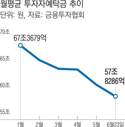 27일 금융투자협회에 따르면 증시 대기 자금 성격인 투자자 예탁금은 올해 들어 매달 감소 추세를 보이고 있다. 매월 평균 투자자 예탁금은 지난 1월 67조3679억원에서 2월 64조6125억원, 3월 62조9965억원, 4월 62조8526억원, 5월 59조9958억원으로 감소했다. 이달에는 지난 23일까지 평균 57조8286억원으로 집계됐다.