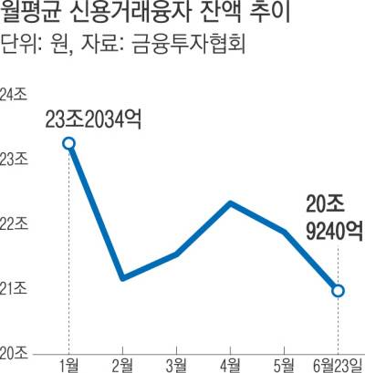 ‘빚투(빚내서 투자)’ 규모를 보여주는 신용거래융자 잔액도 줄어드는 추세다. 신용거래융자는 증권사가 고객의 주식 등을 담보로 잡고 일정 기간 자금을 빌려주는 대출이다. 금융투자협회에 따르면 이번 달 일평균 신용거래융자 잔액은 20조9240억원으로 집계됐다. 지난달 일평균 21조8320억원을 기록했던 것에 비해 4%가량 감소했다. 신용거래융자 잔액은 지난 23일에는 19조2160억원으로 올해 들어 가장 낮은 수준을 기록하기도 했다.