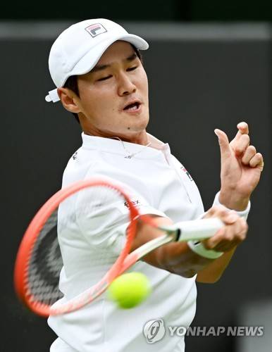 epa10036660 Kwon Soon-woo of South Korea hits a forehand during his men's first round match against Novak Djokovic of Serbia at the Wimbledon Championships, in Wimbledon, Britain, 27 June 2022. EPA/ANDY RAIN EDITORIAL USE ONLY