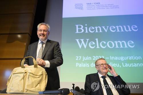 epa10036712 John Coates (R) President of the CAS and Matthieu Reeb (L) director of the CAS during the inauguration of the new headquarters of the international Court of Arbitration for Sport, CAS, at the Palais de Beaulieu, in Lausanne, Switzerland, 27 June 2022. EPA/LAURENT GILLIERON