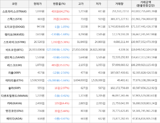 한편 거래금액 기준으로는 스트라티스, 스택스, 도지코인 순으로 가장 활발한 거래를 보이고 있다.