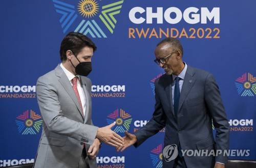 Canadian Prime Minister Justin Trudeau shakes hands with Rwanda President Paul Kagami during a bilateral meeting at the Commonwealth Heads of Government Meeting in Kigali, Rwanda on Friday, June 24, 2022. (Paul Chiasson /The Canadian Press via AP) MANDATORY CREDIT