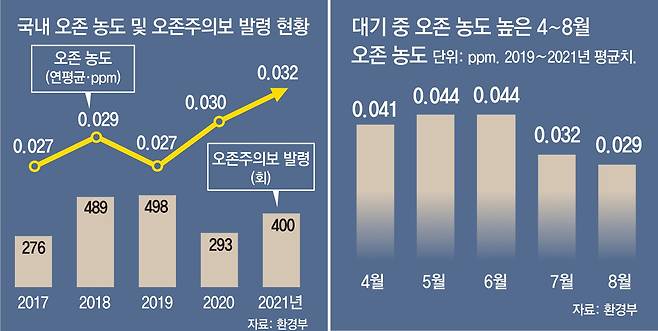국내 오존 농도는 갈수록 높아지고 있어 오존 노출에 더 주의해야 한다. 특히 전국 오존주의보 발령 횟수는 2016년부터 급증하고 있다. 2016년부터 지난해까지 6년 동안 연평균 오존주의보 발령 횟수는 약 366회로, 그 전 6년 평균(104회)보다 3.5배로 늘어났다.