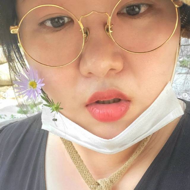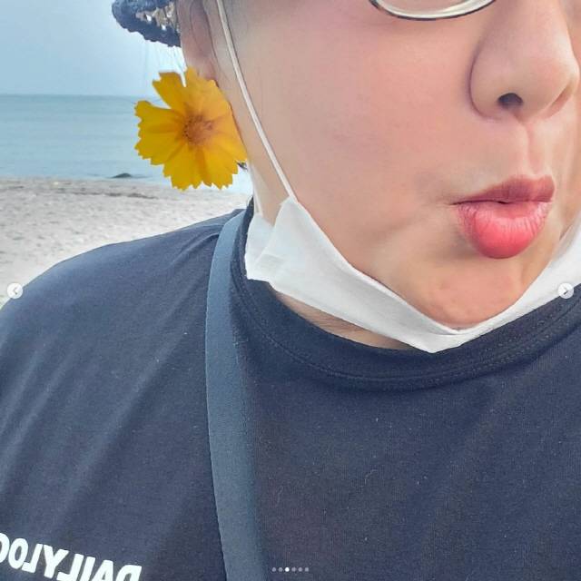 또 하재숙은 남편이 귀에 꽂아준 꽃을 보며 셀피를 남기고 있다.