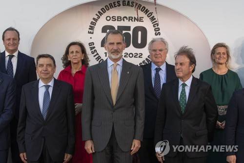 epa10037515 Spain's King Felipe (C), Osborne's Group President Ignacio Osborne (2-R) and Spanish Minister of Agriculture Luis Planas (2-L) pose for a photo during a visit to the Osborne Winery in Puerto de Santa Maria, Cadiz, 27 June 2022, on the occasion of the company's 250th anniversary. EPA/Roman Rios