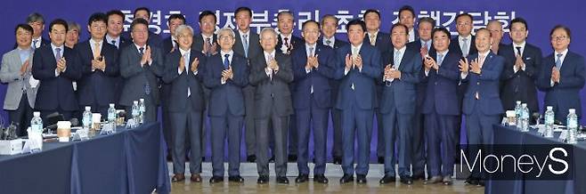 추경호 경제부총리 겸 기획재정부과 손경식 경총회장을 비롯한 참석자들이 28일 오전 서울 마포구 한국경영자총협회(경총)에서 열린 '경총 간담회'에서 기념촬영을 하고 있다.