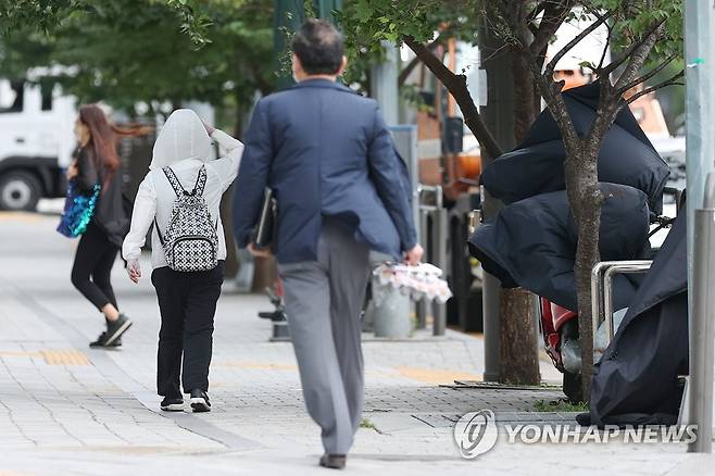 (서울=연합뉴스) 신현우 수습기자 = 서울 등 수도권 서부에 강풍주의보가 발효된 28일 오전 서울 용산구 한강대로에서 시민들이 바람을 맞으며 걸어가고 있다. 2022.6.28