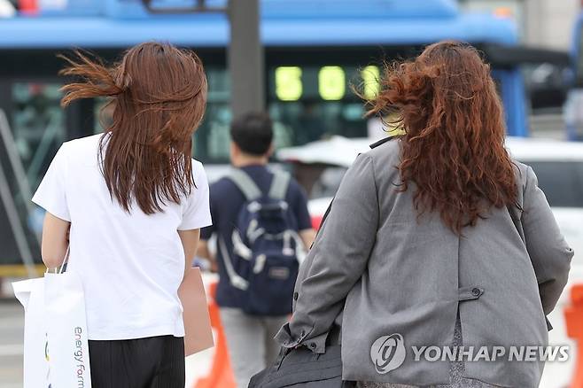 (서울=연합뉴스) 신현우 수습기자 = 서울 등 수도권 서부에 강풍주의보가 발효된 28일 오전 서울역 인근에서 시민들이 바람을 맞으며 걸어가고 있다. 2022.6.28