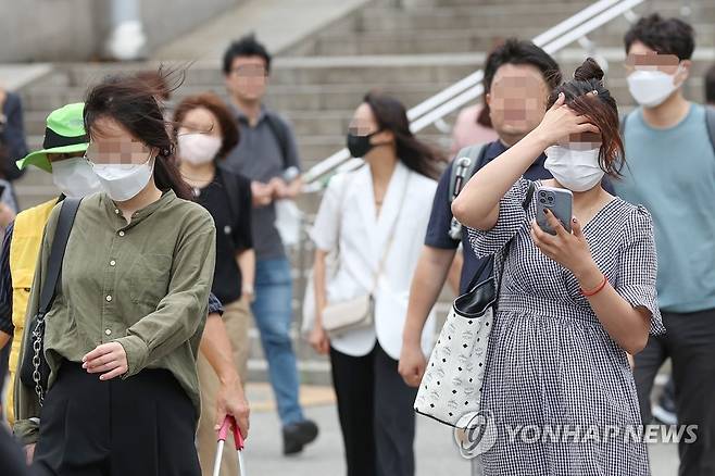 (서울=연합뉴스) 신현우 수습기자 = 서울 등 수도권 서부에 강풍주의보가 발효된 28일 오전 서울역 인근에서 시민들이 바람을 맞으며 걸어가고 있다. 2022.6.28