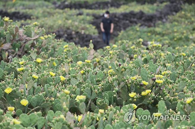 (제주=연합뉴스) 박지호 기자 = 28일 오전 제주시 한림읍 월령리 선인장 군락에 꽃이 피어 오가는 이의 눈길을 끌고 있다. 2022.6.28