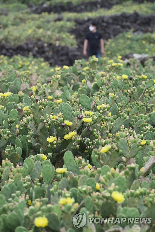 (제주=연합뉴스) 박지호 기자 = 28일 오전 제주시 한림읍 월령리 선인장 군락에 꽃이 피어 오가는 이의 눈길을 끌고 있다. 2022.6.28