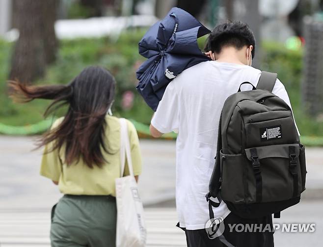 (서울=연합뉴스) 서대연 수습기자 = 중부지방에 비와 강풍이 예보된 28일 오전 시민들이 서울 중구 을지로입구역 인근에서 바람을 맞으며 출근하고 있다. 2022.6.28