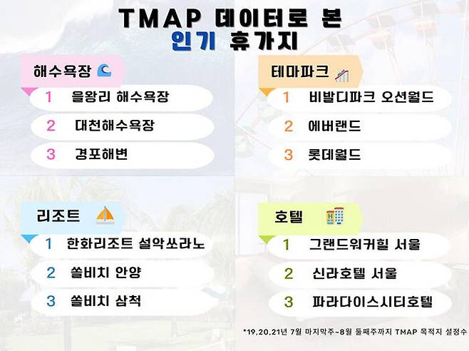 티맵모빌리티는 2019∼2021년 각 해의 7월 마지막 주부터 8월 둘째 주까지 '티맵 목적지 설정 건수'를 분석한 결과, 가장 인기 있는 휴가지가 을왕리 해수욕장(11만 6천500건)으로 나타났다고 오늘(28일) 밝혔습니다.