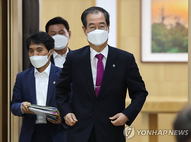 (세종=연합뉴스) 김주형 기자 = 한덕수 국무총리가 28일 오전 정부세종청사에서 열린 국무회의에 입장하고 있다. 2022.6.28