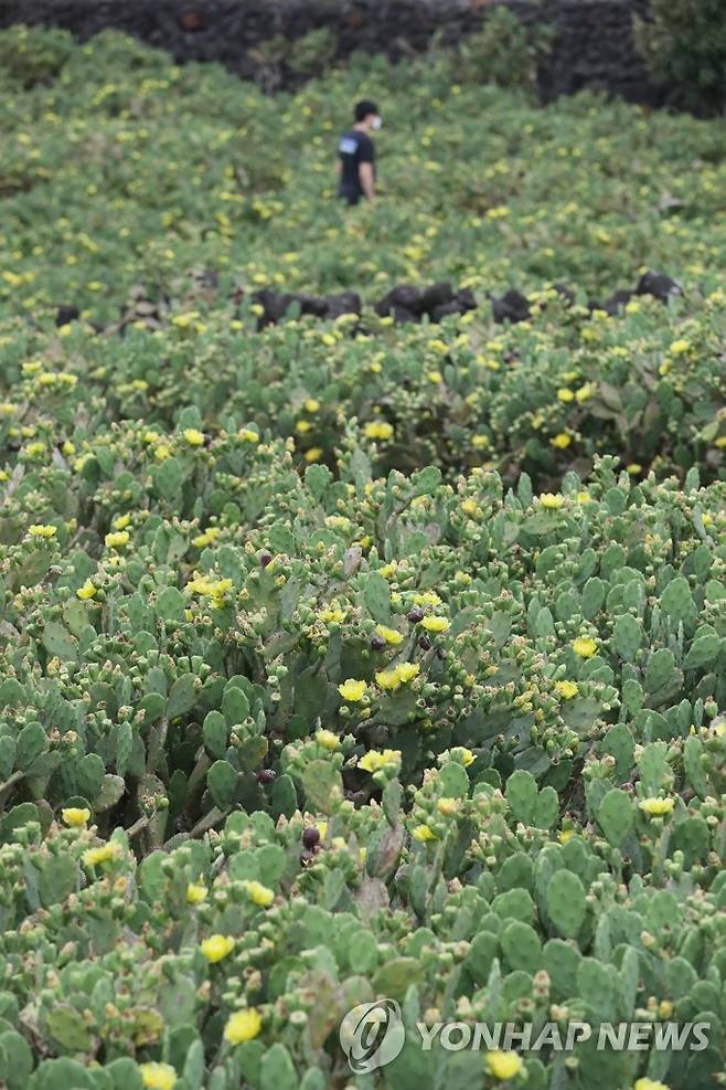 (제주=연합뉴스) 박지호 기자 = 28일 오전 제주시 한림읍 월령리 선인장 군락에 꽃이 피어 오가는 이의 눈길을 끌고 있다. 2022.6.28