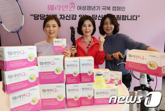 (서울=뉴스1) 송원영 기자 = 28일 서울 중구 더 플라자호텔에서 열린 '동국제약 훼라민퀸 여성갱년기 극복 캠페인'에서 모델들이 훼라민큐를 선보이며 사이클, 배드민턴, 등산 등의 스포츠를 통해 갱년기를 활기차게 보내는 모습을 연출하고 있다. '훼라민퀸 여성갱년기 극복 캠페인'은 갱년기 증상을 방치하지 말고 적극적으로 관리하자는 취지로 진행됐다. 2022.6.28/뉴스1