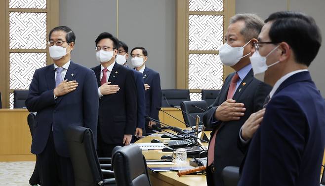 [지난 14일 국무회의에서 국기에 경례하는 한덕수 총리와 국무위원들 (연합뉴스 자료 사진)]