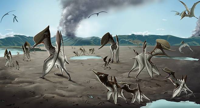 (광주=연합뉴스) 전남대학교가 허민 교수(지구환경과학부·한국공룡연구센터장)연구팀이 전남 화순군 서유리 공룡 화석지에서 익룡의 군집 생활을 증명해 주는 발자국 화석을 세계 최초로 발굴했다고 28일 밝혔다. 사진은 화순 서유리 화석지 복원도 모습. 2022.6.28 [전남대 제공. 재판매 및 DB 금지]