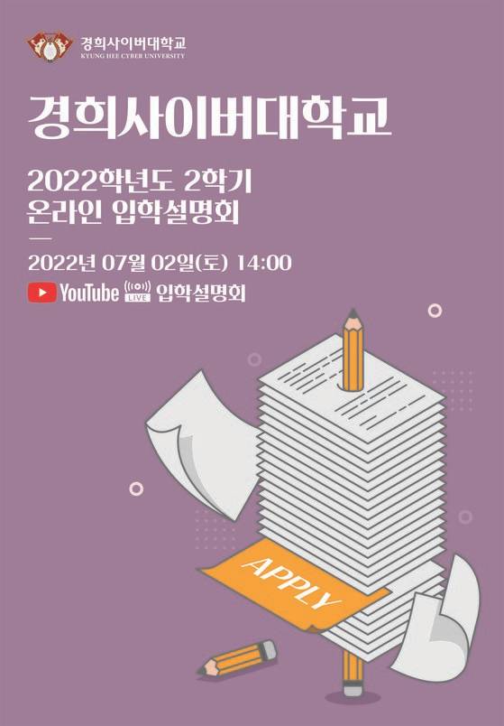 경희사이버대학교(총장 변창구)는 오는 7월 2일(토) 오후 2시 2022학년도 2학기 예비 신·편입생을 위해 온라인 입학설명회를 개최한다.