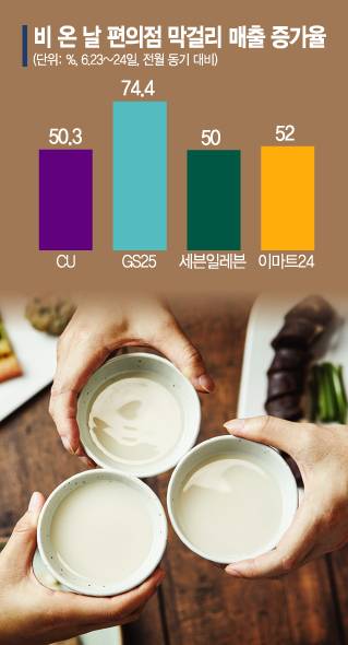 비가 내린 23~24일 CU에서는 막걸리 매출이 전월보다 50.3%, GS25에서는 74.4%, 세븐일레븐에서는 50%, 이마트24에서는 52% 급증했다.