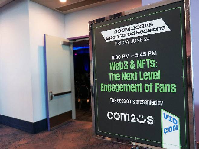 컴투스 그룹은 24일 오후(미국 현지시간) 비드콘의 인더스트리 세션을 통해 'WEB3 & NFTS: THE NEXT LEVEL ENGAGEMENT OF FANS' 주제로 발표를 진행했다. 컴투스USA 소속 시니어 브랜드 매니저 '스콧 차베즈(Scott Chavez)'진행으로 '마이클 리(Michael Lee) 이사'와 '김홍석 매니저'가 세션에 참여했다.