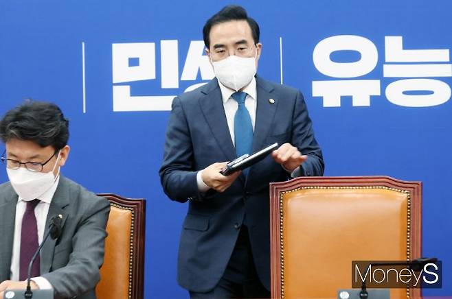 박홍근 원내대표가 28일 서울 여의도 국회 본관 202호에서 열린 더불어민주당 원내대책회의에 참석, 주재를 하기 위해 자리에 착석하고 있다.