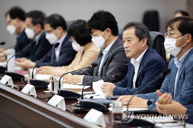 (서울=연합뉴스) 유제철 환경부 차관(오른쪽 두 번째)이 28일 오전 세종시 국책연구단지에서 열린 2022년 상반기 환경부-KEI(한국환경연구원) 환경정책협의회에서 발언하고 있다. 2022.6.28 [환경부 제공. 재판매 및 DB 금지]