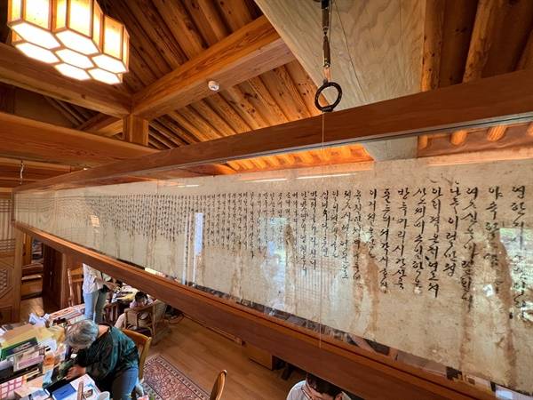 | ▲ 글읽기를 좋아했던 전영애 교수의 모친은 생전에 한글 육전소설 등 수많은 책을 붓으로 필사했다. 여백서원 본관 천정에 가로로 길게 걸어 전시했다. 전 교수는 모친의 이 필사본을 바라보며 학자로서의 마음가짐을 여민다. |
