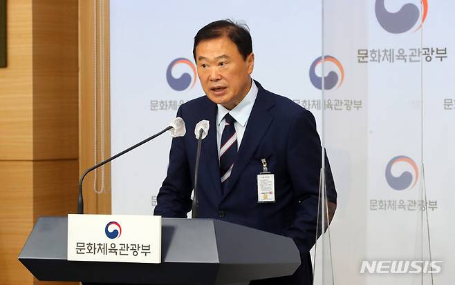 [서울=뉴시스] 배훈식 기자 = 진재수 2023 강릉 세계합창대회 조직위원회 운영추진단장이 28일 오전 서울 종로구 외교부 청사 브리핑실에서 대회 D-1년 브리핑을 하고 있다. 2022.06.28. dahora83@newsis.com