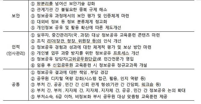 최종적으로 보고서는 정책·사례 검토, 중앙부처 공무원 인식·태도 조사, 전문가 심층조사 결과를 종합한 뒤, 정부부처 간 정보공유 활성화 방안을 ▲공통, ▲법·제도, ▲재정, ▲조직, ▲기술, ▲보안, ▲인적 영역 등으로 구분해 제안했다.