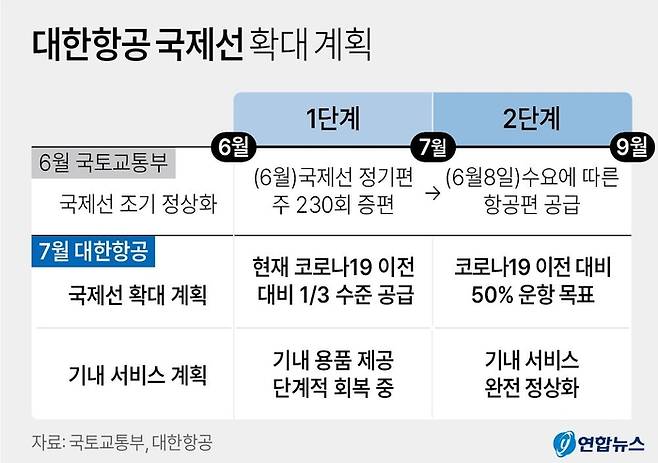 대한항공이 항공 성수기를 앞두고 국제선 운항을 대폭 늘린다. 오는 9월까지 코로나19 이전 대비 50% 이상 수준으로 여객 공급량을 회복시키기로 했다. 이는 국토교통부의 기존 계획보다 3개월가량 앞선 것이다. 올해 6월 현재 대한항공의 여객 공급량은 코로나19 이전의 3분의 1수준에 불과하다.