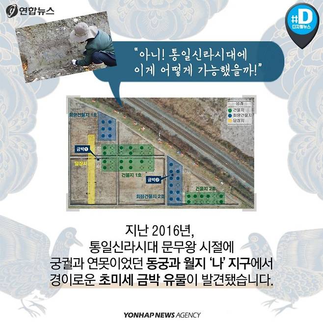 지난 2016년, 통일신라 시대 문무왕 시절에 궁궐과 연못이었던 동궁과 월지 '나'지구에서 경이로운 초미세 금박 유물이 발견됐습니다.