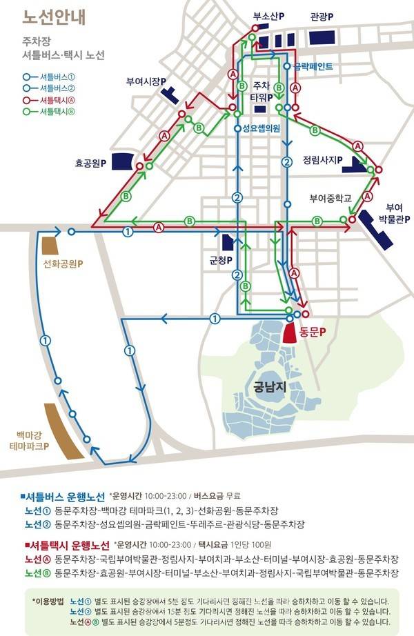 아울러 셔틀택시는 2개 노선에 모두 15대를 투입·운행한다. 행사장(동문주차장)-부여박물관-정림사지-부여치과-부소산-터미널-부여시장-효공원-행사장 구간을 양방향으로 순환하는 코스다. 셔틀버스와 마찬가지로 별도 설치된 승강장에서 5분 정도 대기하면 인당 100원에 정해진 노선을 승하차해 이용할 수 있도록 했다.