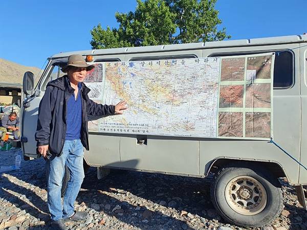 | ▲ 동아지도 대표이자 고조선유적답사회 단장인 안동립씨가 자신이 직접 만든 지도를 푸르공 차에 붙이고 여행일정과 주의사항을 전달하고 있다. |