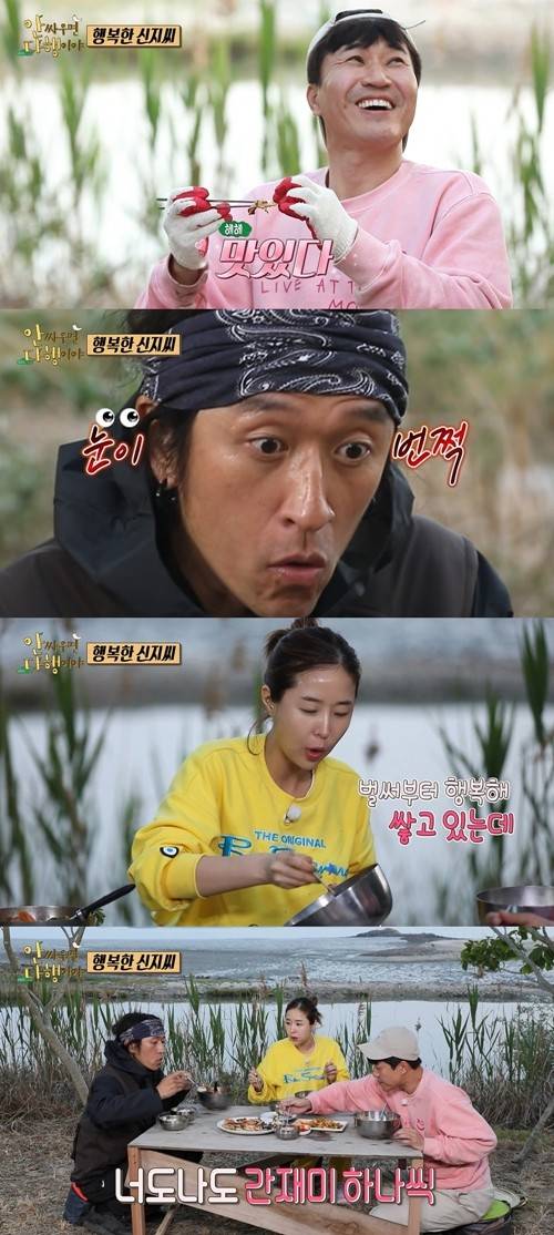 첫 식사 준비에서도 신지가 활약했다. 김종민과 빽가는 "앉아만 있어라"라며 호언장담했으나 허둥지둥했고 신지는 결국 간자미 손질부터 뒷정리, 요리까지 책임졌다. 코요태는 신지의 '하드캐리' 속에서 소라구이, 소라 무침, 숯불 직화 간자미 구이, 간자미 매운탕 등 풍성한 한상차림을 만들어냈다.