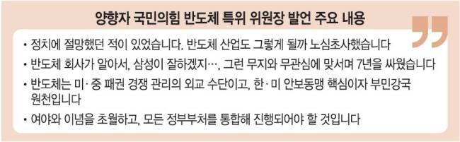 삼성전자 최초의 여성 임원 출신인 양 위원장은 반도체산업 경쟁력 강화를 위해 "특위가 사유와 관례를 초월해 태어난 것처럼 여기에서 일어나는 토론이나 성과가 여야와 이념을 초월해야 한다"고 말했다.
