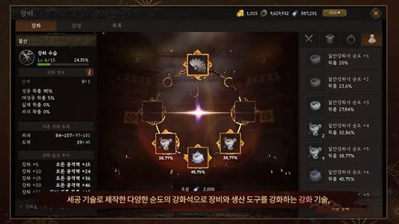 세공 기술로 제작한 다양한 순도의 강화석은 장비와 생산도구 ‘강화’에 쓰인다. 강화 기술에는 감정을 통해 아이템에 추가 옵션을 부여하는 ‘감정’ 기술과 무기에 행운 수치를 높여 최대 공격력 발생 등 확률을 높이는 ‘축복’ 기술이 있다.