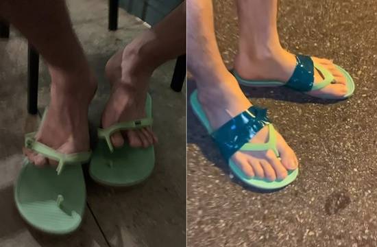 공개된 영상에는 초록색의 슬리퍼 끈이 갑자기 끊어져 급하게 청테이프로 감은 채 걸어가는 김태현의 모습이 담겼다.
