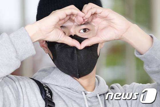 (김포공항=뉴스1) 권현진 기자 = 배우 박보검이 셀린느(CELINE) 남성 여름 2023 패션쇼를 마치고 28일 김포비즈니스항공센터를 통해 프랑스에서 귀국해 하트를 그리고 있다. 2022.6.28/뉴스1