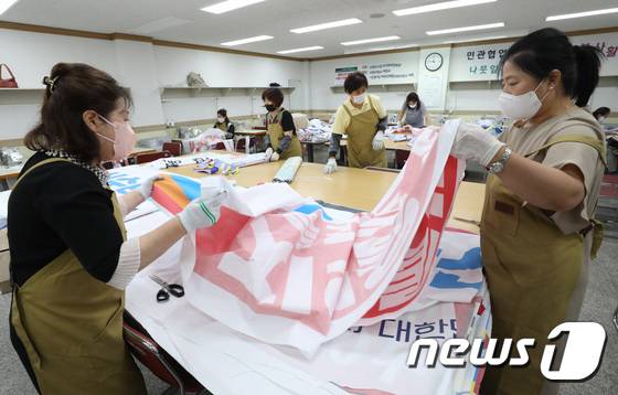 (수원=뉴스1) 김영운 기자 = 28일 오전 경기 수원시 팔달구 수원시가족여성회관에서 경기도 여성단체협의회 수원시지회 회원들과 수원시가족여성회관 관계자들이 지난 6·1지방선거 기간동안 사용하고 버려진 폐현수막으로 낙엽 수거용 자루를 만들고 있다. 2022.6.28/뉴스1