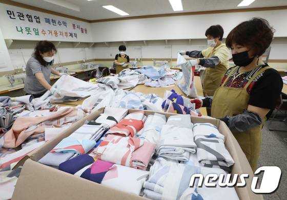 (수원=뉴스1) 김영운 기자 = 28일 오전 경기 수원시 팔달구 수원시가족여성회관에서 경기도 여성단체협의회 수원시지회 회원들과 수원시가족여성회관 관계자들이 지난 6·1지방선거 기간동안 사용하고 버려진 폐현수막으로 낙엽 수거용 자루를 만들고 있다. 2022.6.28/뉴스1