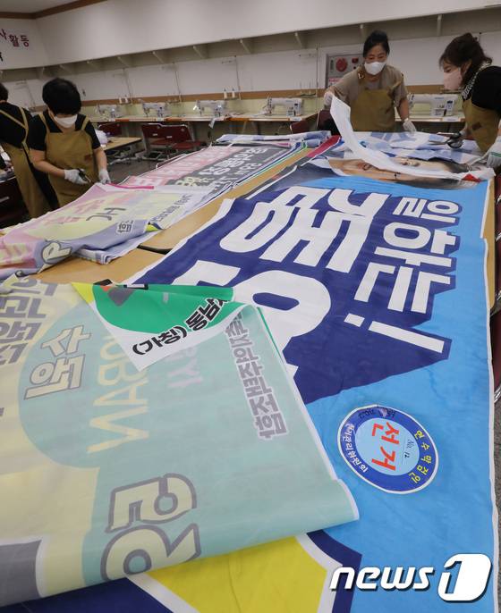 (수원=뉴스1) 김영운 기자 = 28일 오전 경기 수원시 팔달구 수원시가족여성회관에서 경기도 여성단체협의회 수원시지회 회원들과 수원시가족여성회관 관계자들이 지난 6·1지방선거 기간동안 사용하고 버려진 폐현수막으로 낙엽 수거용 자루를 만들고 있다. 2022.6.28/뉴스1
