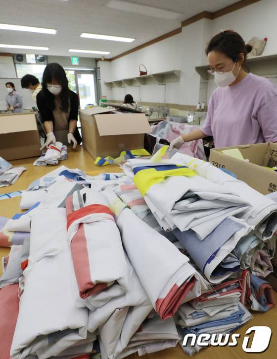 (수원=뉴스1) 김영운 기자 = 28일 오전 경기 수원시 팔달구 수원시가족여성회관에서 경기도 여성단체협의회 수원시지회 회원들과 수원시가족여성회관 관계자들이 지난 6·1지방선거 기간동안 사용하고 버려진 폐현수막으로 낙엽 수거용 자루를 만들고 있다. 2022.6.28/뉴스1