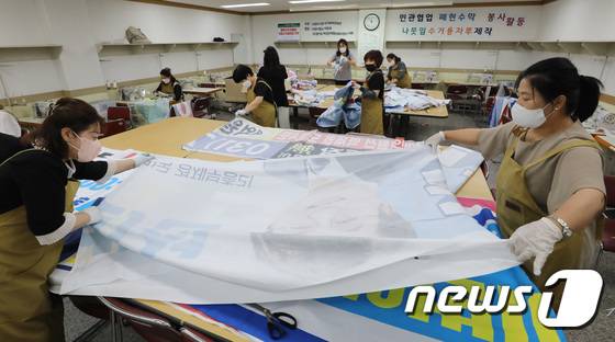 (수원=뉴스1) 김영운 기자 = 28일 오전 경기 수원시 팔달구 수원시가족여성회관에서 경기도 여성단체협의회 수원시지회 회원들과 수원시가족여성회관 관계자들이 지난 6·1지방선거 기간동안 사용하고 버려진 폐현수막으로 낙엽 수거용 자루를 만들고 있다. 2022.6.28/뉴스1