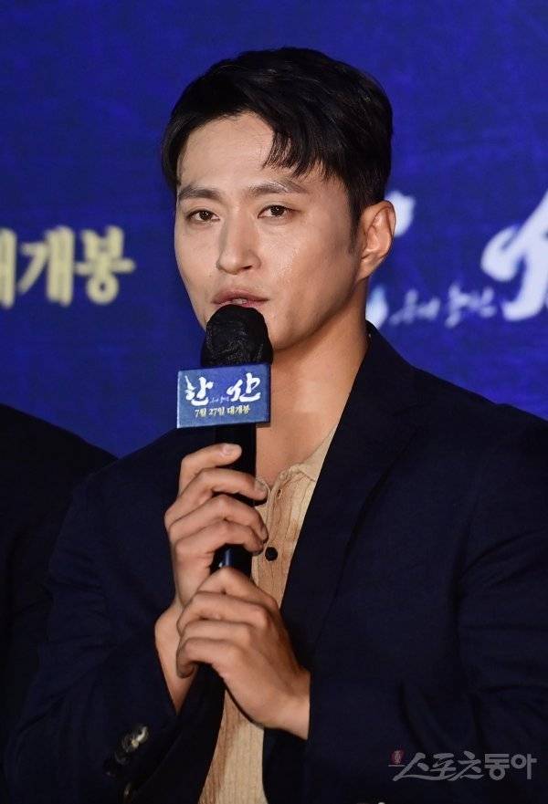 배우 김성규가 28일 서울 광진구 자양동 롯데시네마 건대입구점에서 열린 영화 ‘한산: 용의 출현’ 제작보고회에서 인사말을 하고 있다.