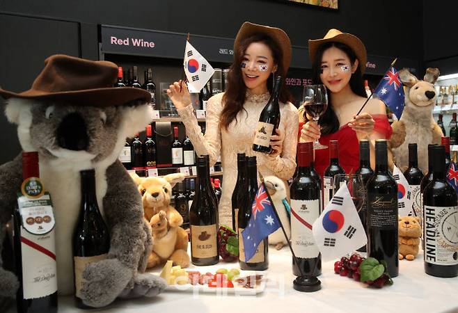 28일 서울 역삼동 세븐일레븐 와인스튜디오에서 '호주 쉬라즈 와인 몰아 마시기' 기획전에서 모델들이 호주 와인을 홍보하고 있다.
