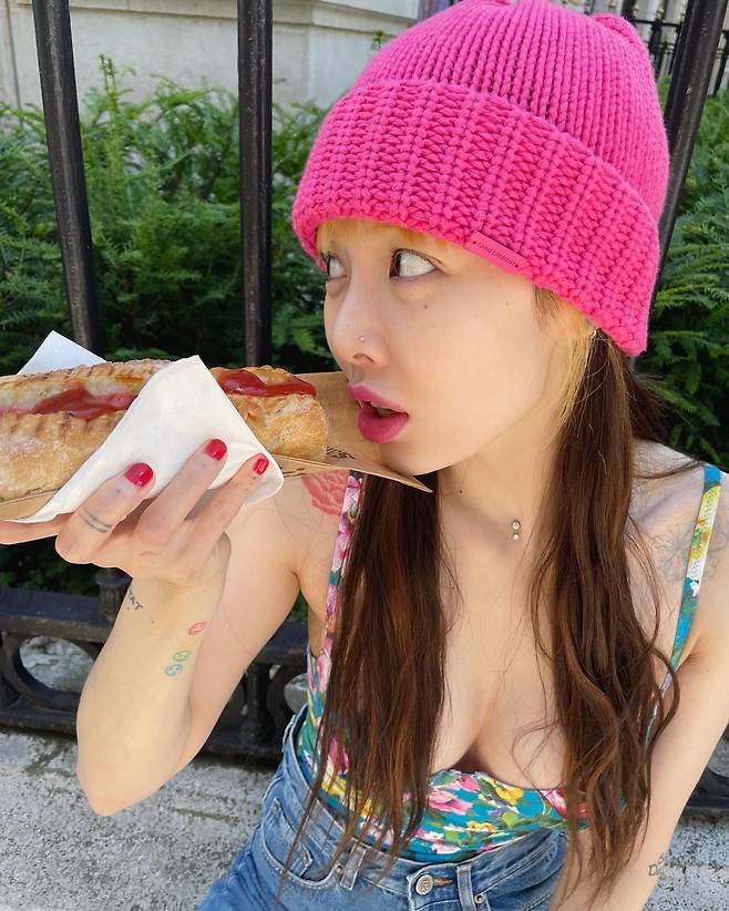 공개된 사진 속 현아는 핑크색 비니를 쓰고서 핫도그를 들고 카메라를 응시하고 있다.